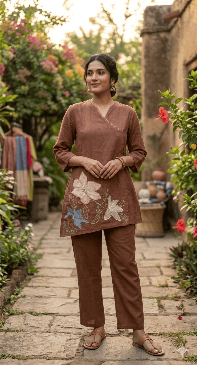 Earthy Brown Cotton Co-ord Set with Floral Applique Embroidery
