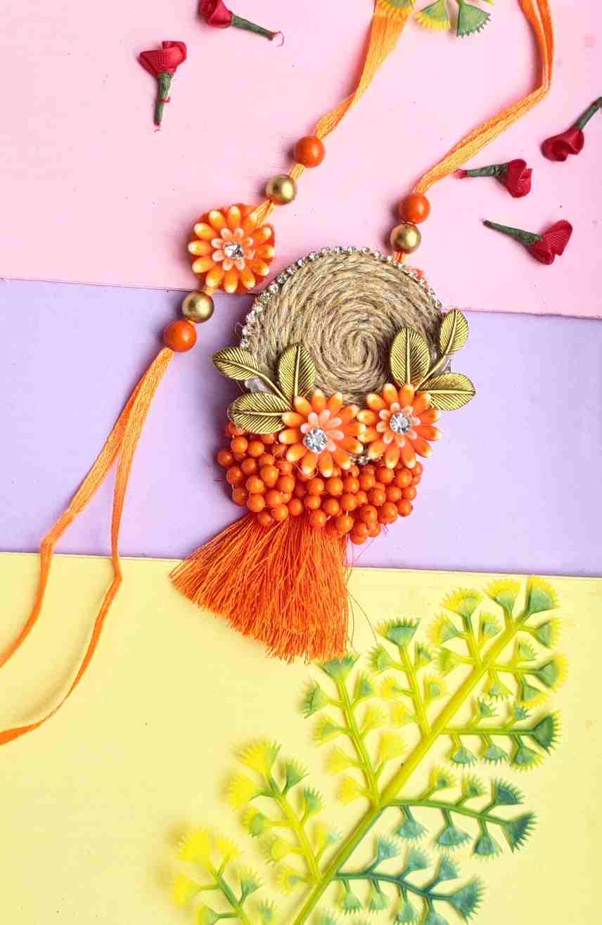 Couple rakhi for bhaiya and bhabhi with orange colour flower and jute base